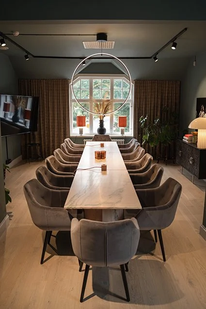 Vårt största mötesrum med generöst långbord och liten loungedel.